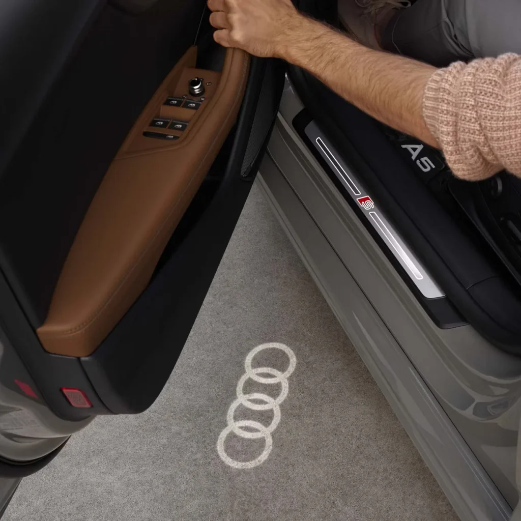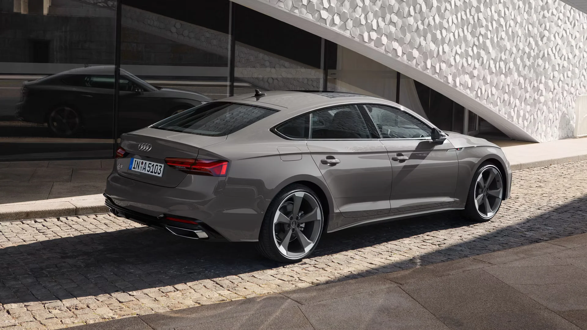 Wide air inlets and chrome trim give the front of this sporty five-door vehicle its edge. At the sides, mid-heavy sills underscore its sportiness and pronounced wheel arches emphasise the optional 20-inch alloy wheels. Horizontal trim in matt aluminium silver on the diffuser and trapezoid tailpipe trims reinforce the wideness of the rear. In addition, the Audi A5 Sportback can be customised with the optional advanced and S line equipment lines.