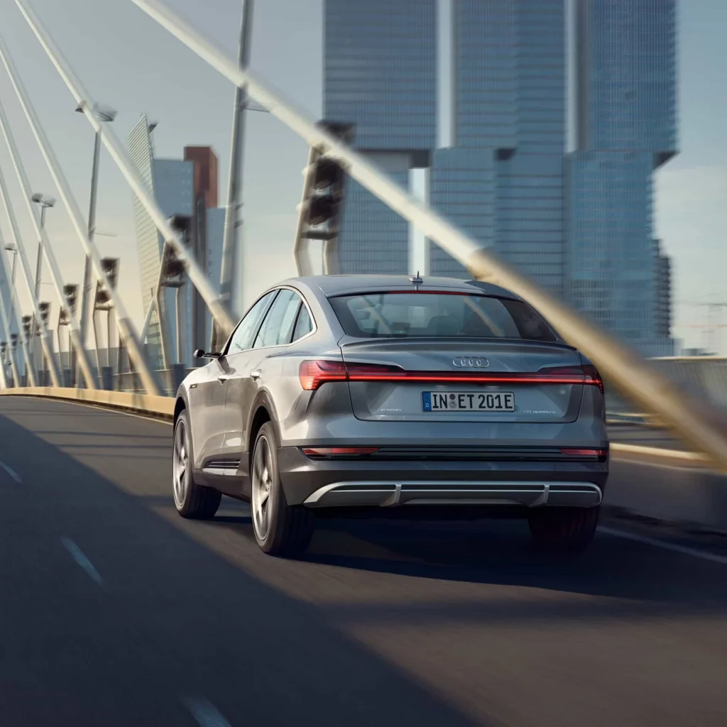 The Audi e-tron Sportback exudes impressively sporty elegance. The athletic design elements on the sills reveal the low-mounted battery and create a visual centre of gravity.
