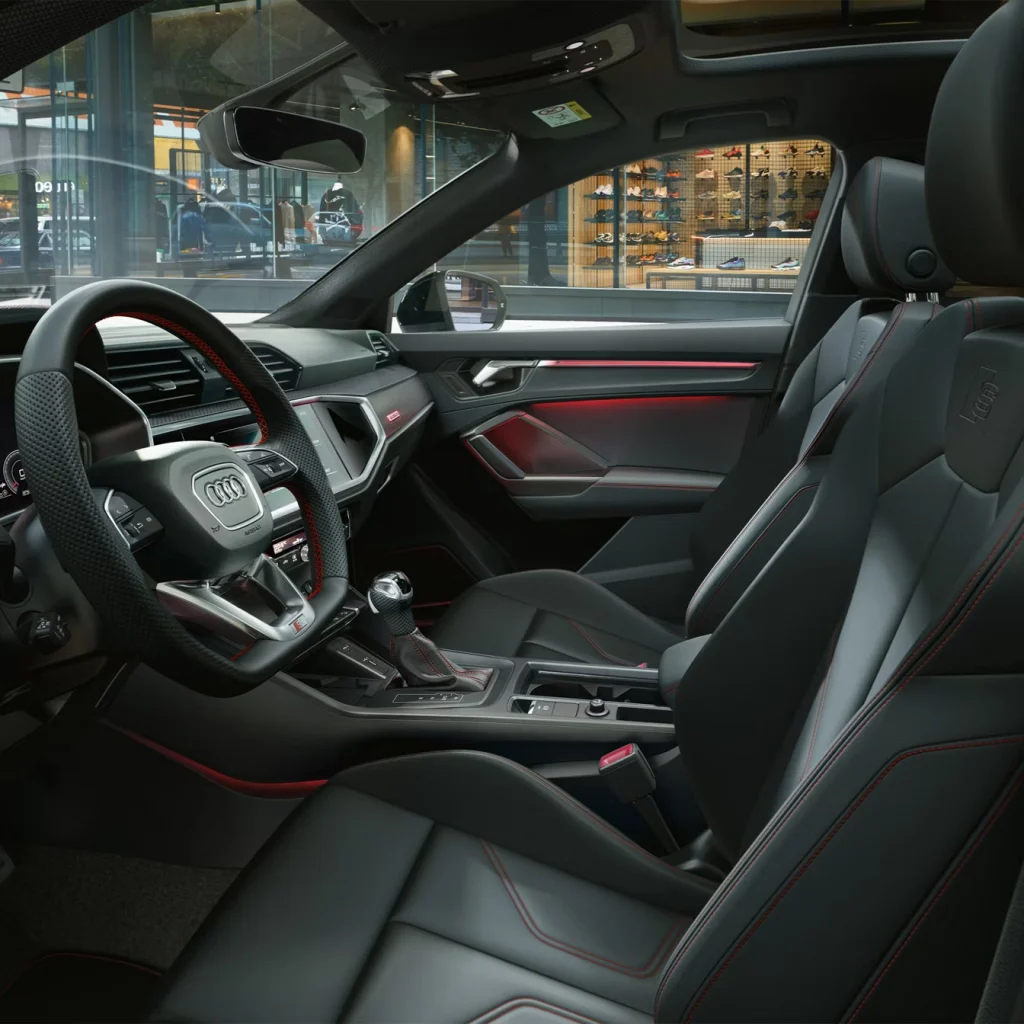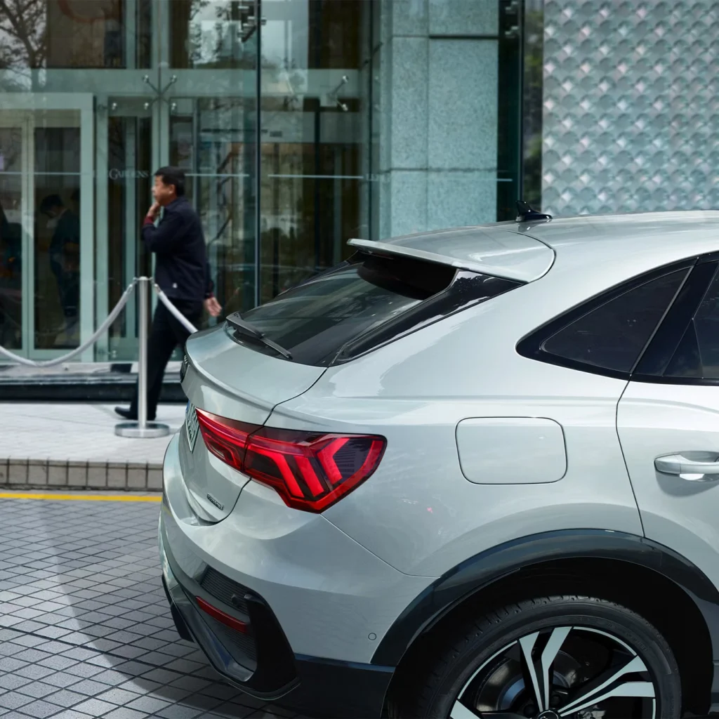 The large Singleframe grille in octagonal design and the side air inlets dominate the front of the Q3 Sportback. From the side, the coupé-like silhouette is unmistakeable. Characteristics of the rear include the flowing, sloping roof line, the low rear window and the sharply contoured rear lights. Customise the exterior to suit your individual taste. If you choose the optional S line, your Audi Q3 Sportback will come with bumpers in contrasting paint finish, alloy wheels in 5-V-spoke S design, illuminated door sill trims with aluminium inlays and S logo at the front and more.