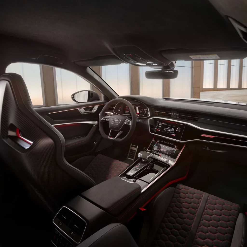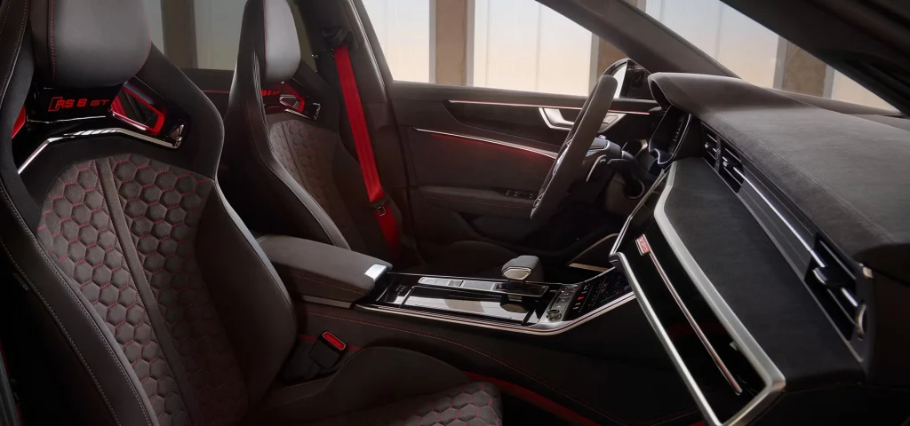 The special features of the RS 6 Avant GT, are continued inside the vehicle: for example, with door rails and dashboard in Dinamica microfibre, black and inlays in Dinamica microfibre, deep black. The striking contrasting stitching in gloss copper and red are equally as exclusive.
