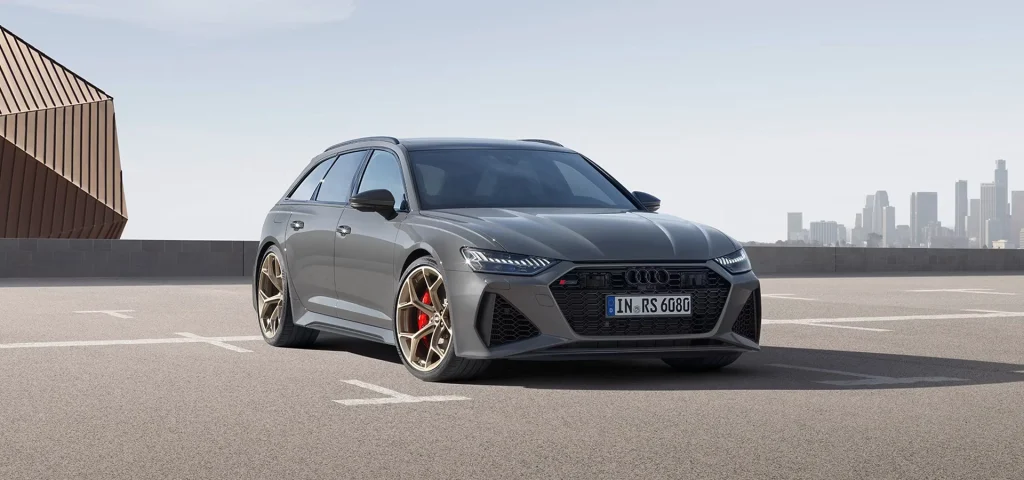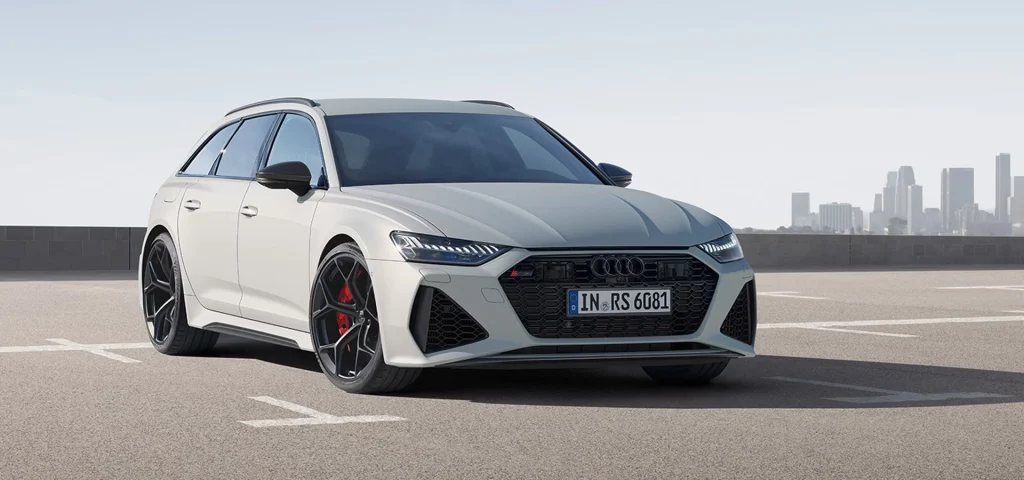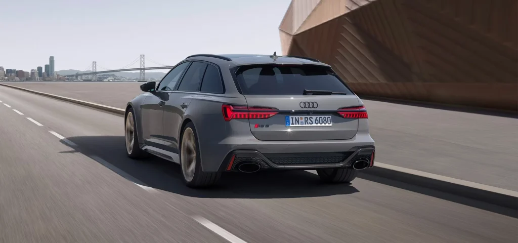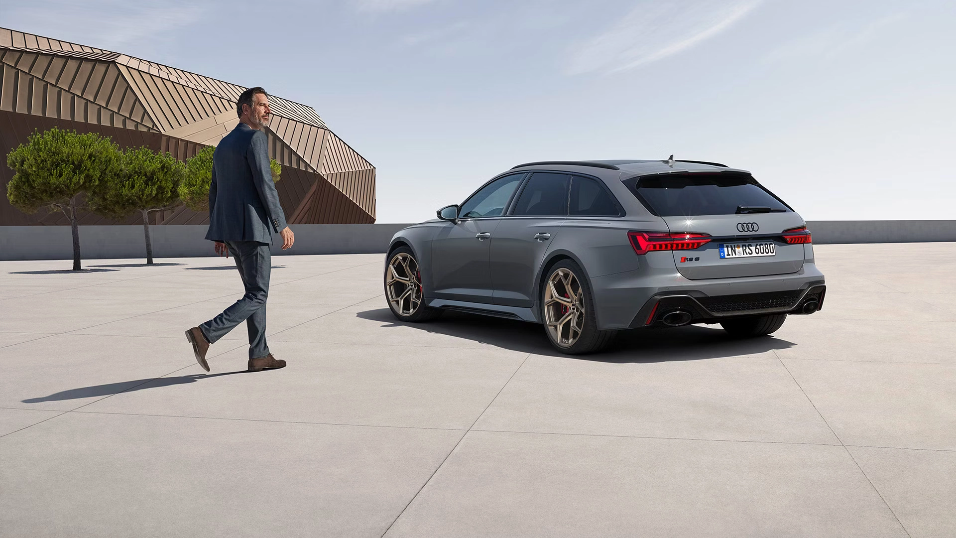 The more powerful performance version of the Audi RS 6 Avant is shown off to best advantage with the optional matt carbon styling package with matching exterior mirrors and new 22-inch alloy wheels.